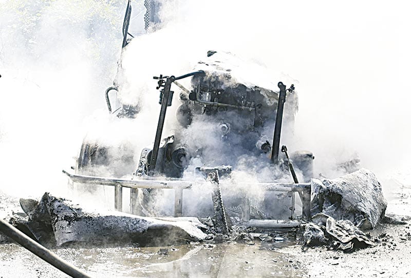 Testigos del incidente reportaron que no hubo nada que pudieran hacer más que observar cómo la cabina del tráiler, que transportaba un doble remolque, se consumía lentamente por el fuego.