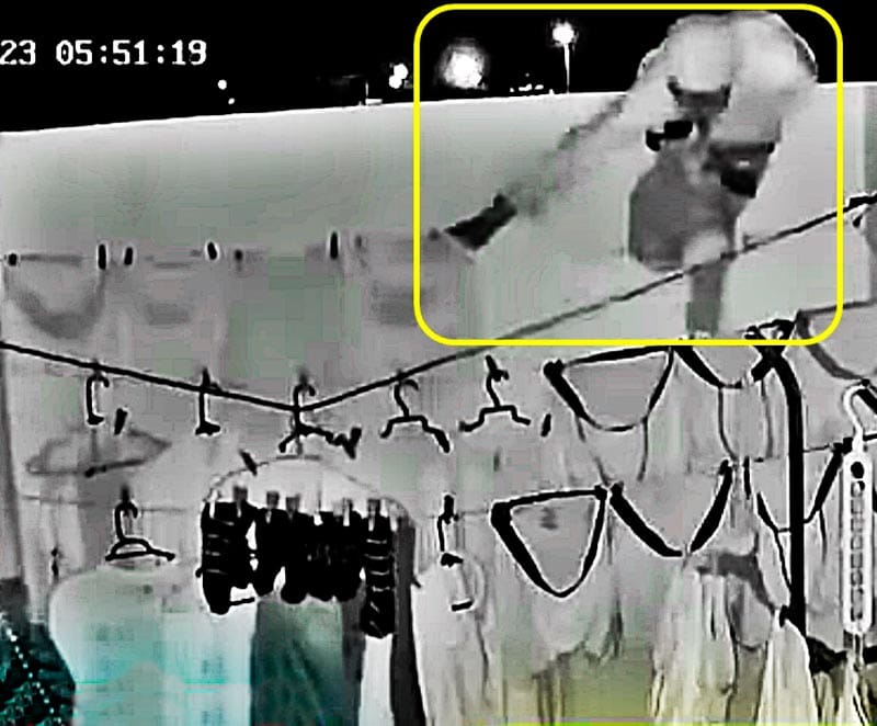 Cuando revisaron sus dispositivos de vigilancia, se dieron cuenta como un sujeto desconocido, que lleva puesta una gorra, salta sobre la barda de su patio, y comienza a desprender toda la ropa que está en los tendederos, entre ella calzones y demás ropa interior.