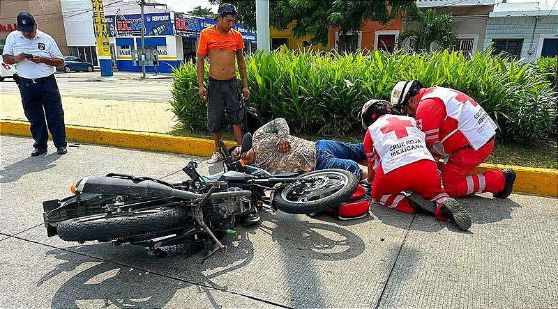 En céntricas calles de la ciudad de Veracruz, dos hombres acabaron lesionados, al accidentarse en su motocicleta contra un automóvil, tipo Versa, movilizándose los cuerpos de emergencia y agentes de vialidad.