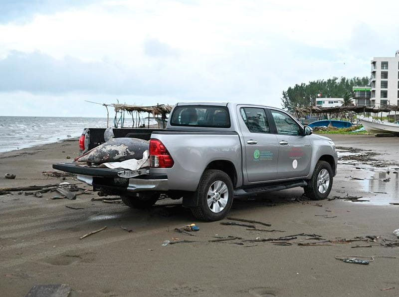 Minutos más tarde arribó personal de la Comisión Nacional de Áreas Naturales Protegidas (CONANP), quienes realizaron la toma de muestras biológicas y la inspección preliminar para determinar las características de la especie y las posibles causas de su muerte.