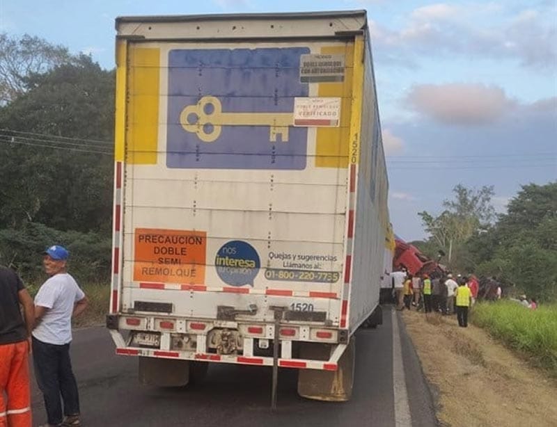 Tras el choque, el camión torton color rojo volcó y prácticamente aplastó la cabina del camión de Coppel, provocando la muerte de los dos trabajadores de Coppel, los cuales quedaron prensados en la cabina.