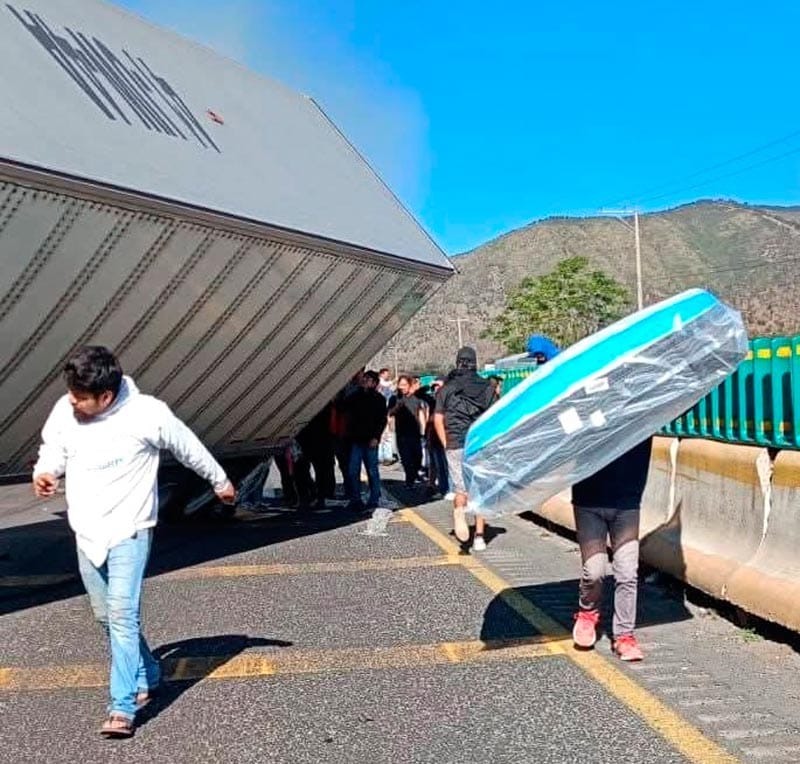 Civiles que se dedican a la rapiña “reventaron” uno de los semirremolques tipo caja del Freightliner y sustrajeron colchones y motocicletas, además de otros electrodomésticos, en una práctica lamentable que no han erradicado las corporaciones policíacas.