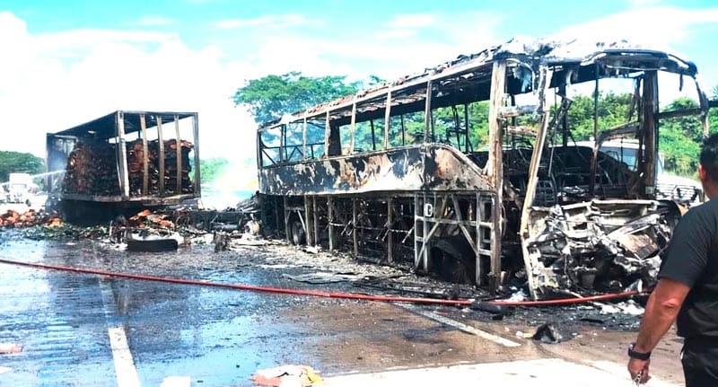 Un autobús de la línea ADO y un tractocamión se incendiaron después de participar en un accidente múltiple sobre autopista Veracruz-Córdoba, tramo Cuitláhuac-La Tinaja, en el municipio de Carrillo Puerto, con un saldo de 14 pasajeros lesionados.