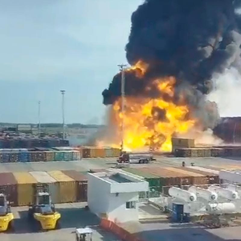 Asipona Veracruz confirmó que el incendio en la Terminal de Contenedores de ICAVE, de Bahía Norte, ocurrió en un contenedor con productos químicos (aerosoles) y que se había extendido el fuego a otros contenedores.