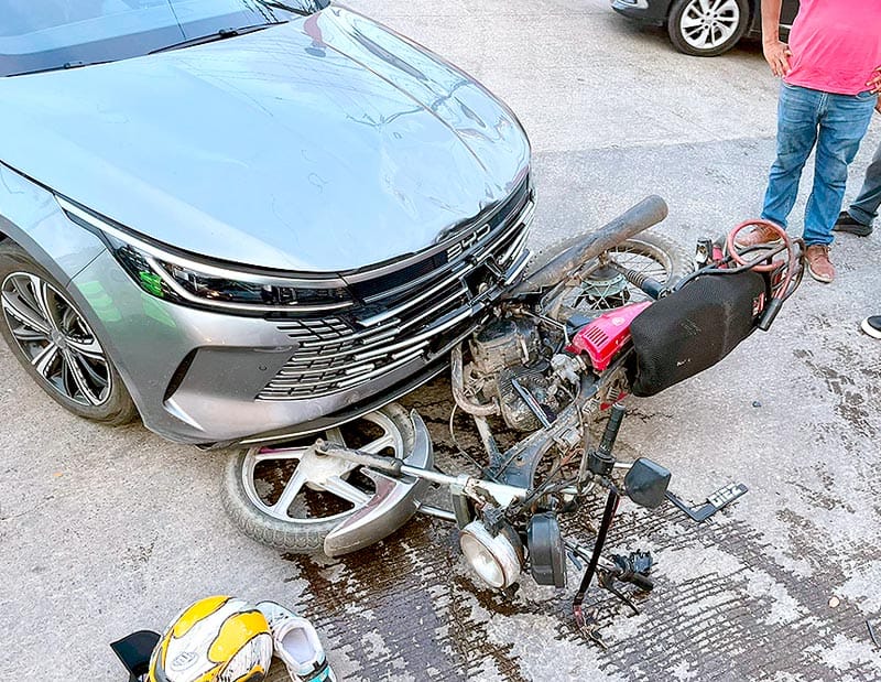 La moto terminó prácticamente debajo del coche mientras el conductor salió proyectado contra el pavimento, quedando con fuertes lesiones en una de sus extremidades*