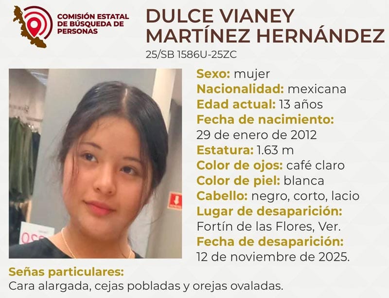 Mientras que, en otra ficha de búsqueda se reportó la desaparición de Dulce Vianey Martínez Hernández de 13 años.