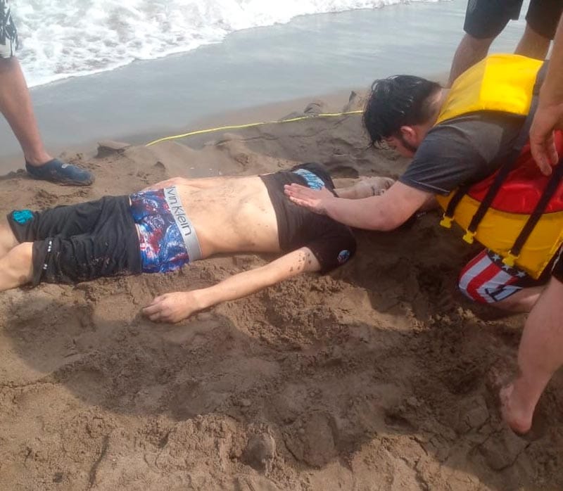 Fueron los propios bañistas y el rescatista Juan Carlos Llaca quienes sacaron a Sandro Tomás P.G., el chico estaba inconsciente y los paramédicos de Cruz Ámbar procedieron con maniobras de reanimación pulmonar.