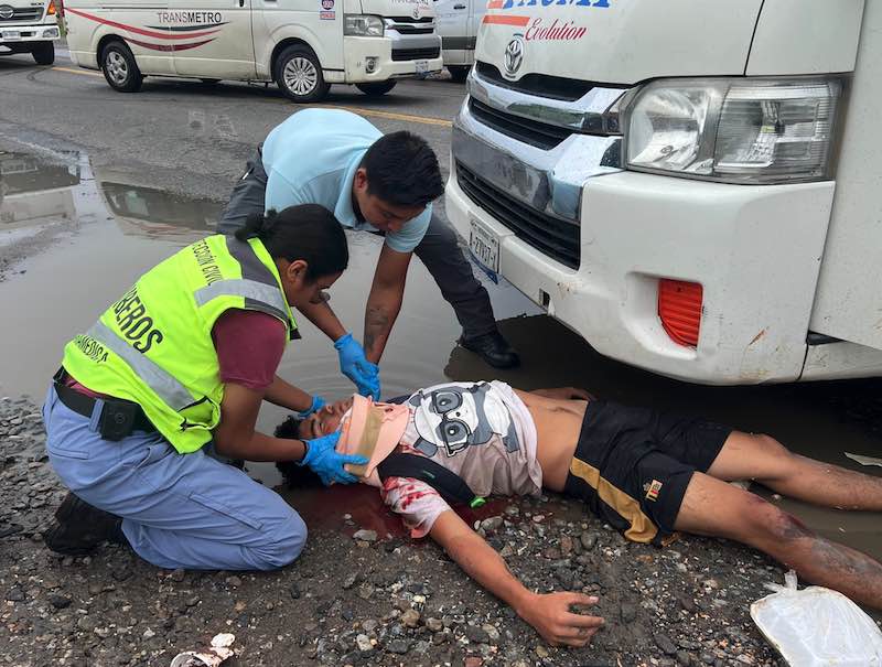 El impacto se dio contra el costado de la combi, lo que provocó que ambos jóvenes salieran proyectados hacia el pavimento con lesiones de consideración.