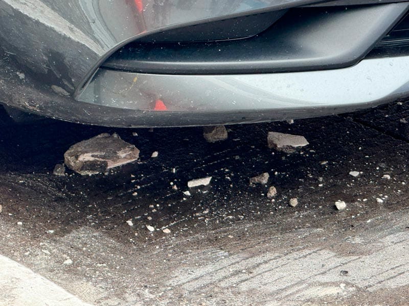 Testigos indicaron que la humedad acumulada habría debilitado la estructura del edificio, provocando que un pedazo de la cornisa se desprendiera y cayera sobre el toldo del automóvil.