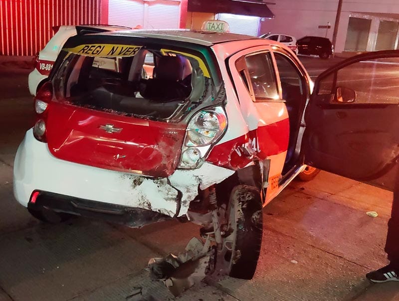 A la altura del fraccionamiento Villa Rica, en la zona norte de la ciudad de Veracruz, este fin de semana, colisionaron dos unidades del servicio de taxi por alcance, dejando severos daños materiales, una persona con golpes, caos vial y la presencia de los cuerpos de emergencia.