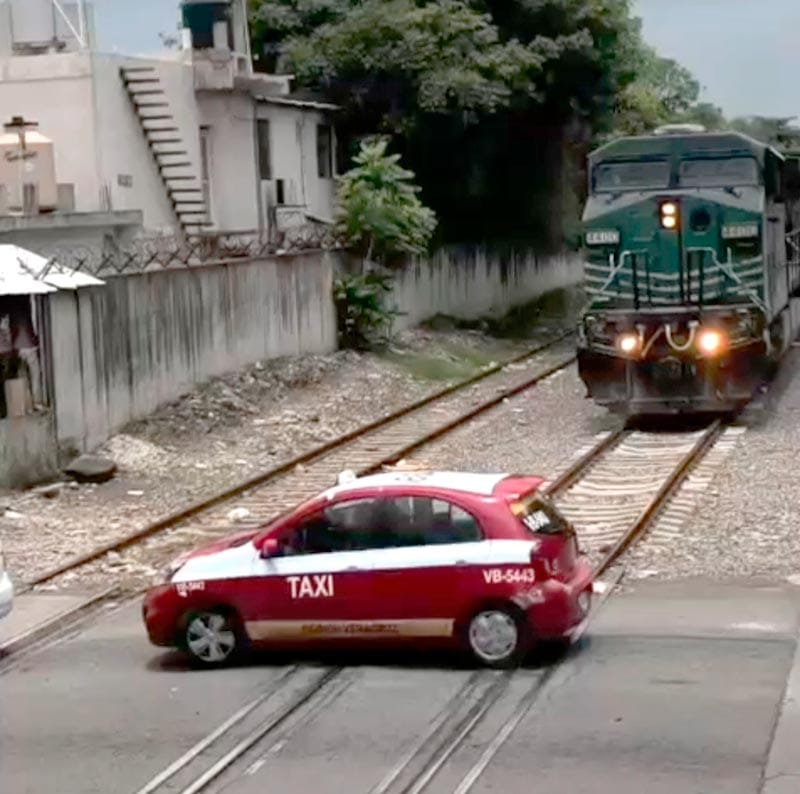 Una escena de alto riesgo fue captada en video ayer lunes en la colonia Vías Férreas del municipio de Veracruz, donde un taxi del servicio público estuvo a punto de ser embestido por una locomotora al quedar detenido sobre las vías.