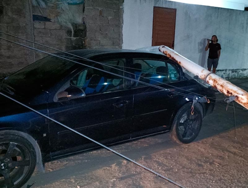 Las rachas de viento generaron que cayera el poste dañando varias líneas de televisión por cable, el medallón y parte del toldo de un automóvil, marca Pontiac, con placas YHD-906-B, el cual estaba estacionado.