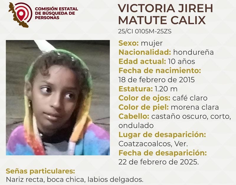 Junto a ella, también desapareció su hija, Victoria Jireh Matute Calix, de 10 años, quien mide 1.20 metros, tiene tez morena clara, ojos café claro y cabello corto, ondulado y castaño oscuro.