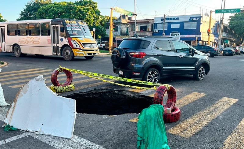 El agujero, de aproximadamente dos metros de diámetro y metro y medio de profundidad, se abrió de manera repentina ante la vista de los testigos, quienes señalaron que, afortunadamente, ningún vehículo se encontraba justo encima en ese momento.