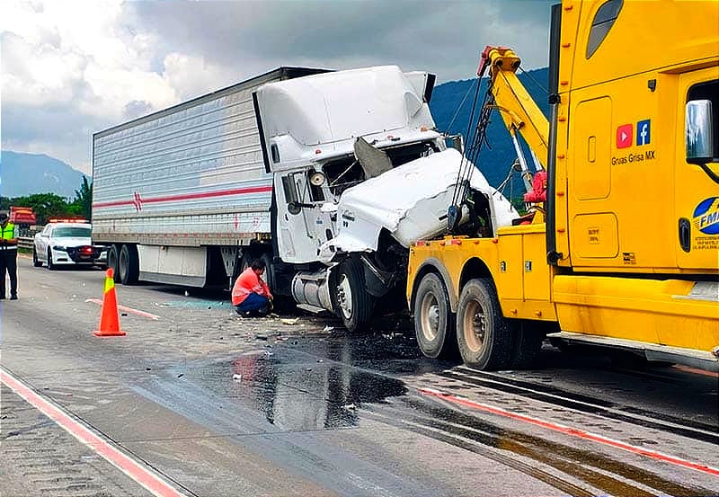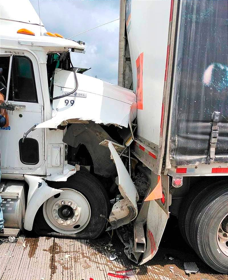 El tractocamión sin control posteriormente chocó a un tráiler marca Volvo, de color blanco con azul y placas del SPF 511FE8, que jalaba dos semi remolques articulados tipo cortina cargados con cerveza y otra más marca Kenworth Kenmex, de color blanco y con placas 304FF4 del SAF, de igual forma cargado con cerveza de la empresa Heineken México.