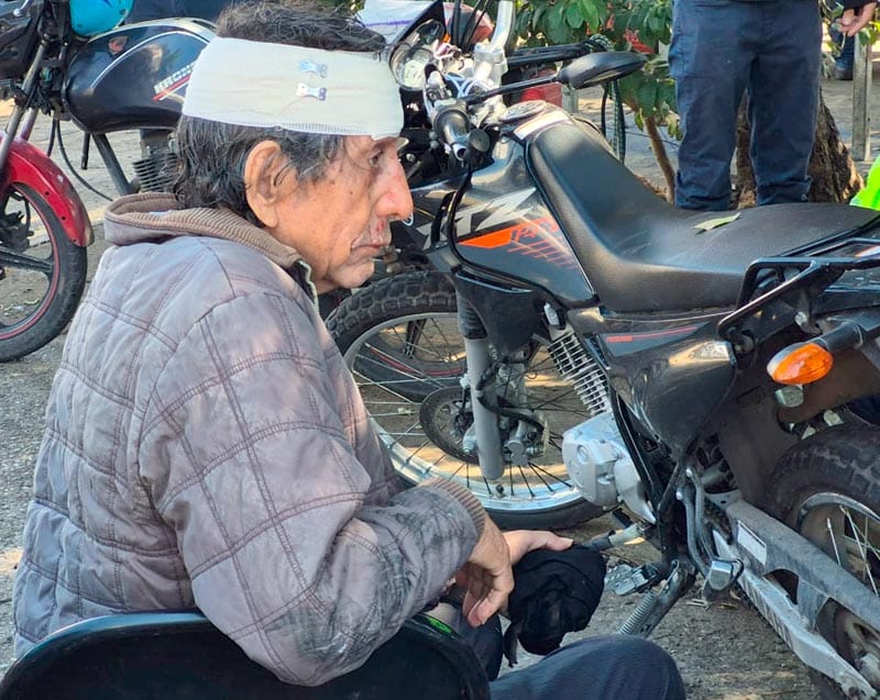 Sin detener su trayectoria, el motociclista atropelló a un adulto mayor, tras lo cual ambos cayeron al pavimento.