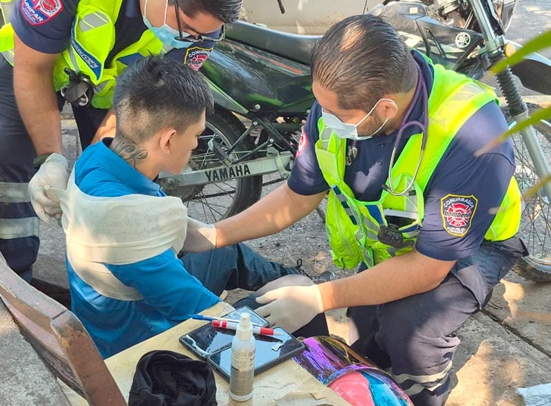 Paramédicos valoraron a los tres lesionados, el motociclista, el hombre que desayunaba puesto y el adulto mayor.