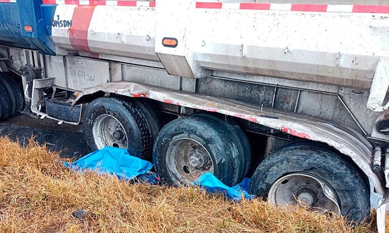 Mientras daba los giros y cruzaba hacia el carril contrario embistió a los dos pasajeros de la moto, provocándoles la muerte de manera instantánea, ambos cuerpos quedaron entre las llantas del tráiler y la cuneta.
