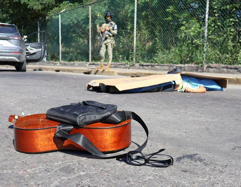 A unos pasos del lugar quedó la guitarra con la que Teodomiro solía ganarse la vida cantando en autobuses.