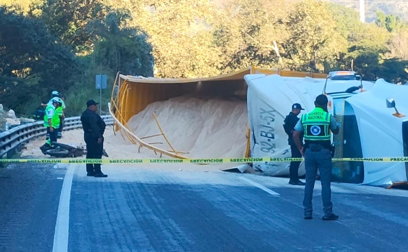 El grano que transportaba el tractocamión en el doble semirremolque quedó esparcido sobre el asfalto y obligó al cierre de la circulación vehicular, pues el tráiler quedó volcado sobre el costado derecho.