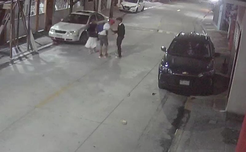 La mujer toma distancia, pero al ver que su acompañante era sometido, se acercó para asestar un golpe en el rostro del agresor, quien no se inmutó y terminó por huir con tranquilidad.