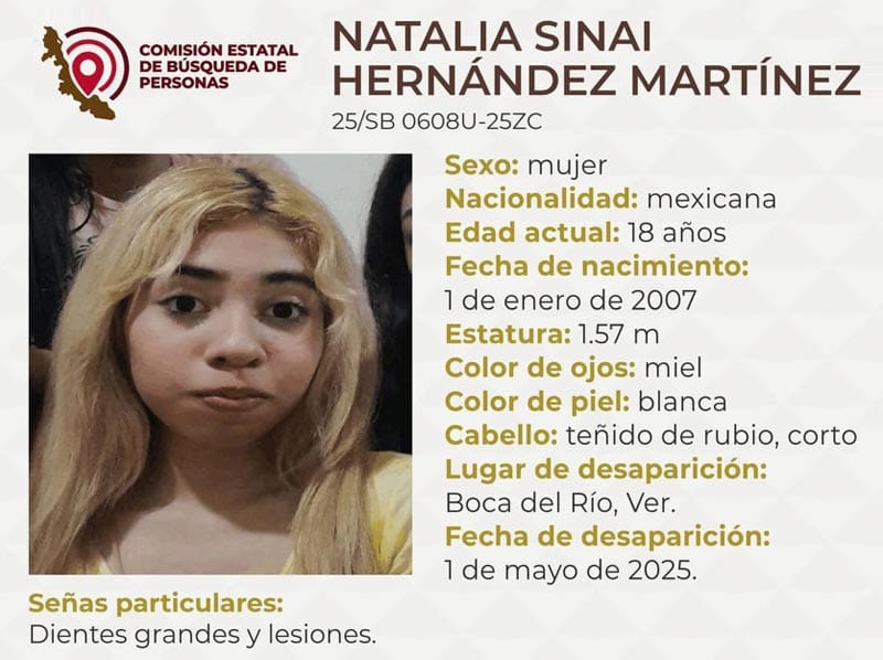 También al tiempo se reporta el caso de Natalia Sinai Hernández Martínez, también mexicana de 18 años de edad, nacida el primero de enero de 2007, estatura de 1.57 metros, ojos color miel, piel blanca, cabello teñido de rubio, corto y crespo, lugar de desaparición Boca del Río,