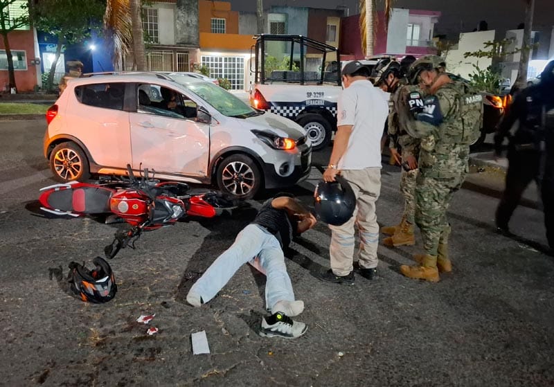A la altura de la unidad habitacional Las Vegas, en el municipio de Boca del Río, dos obreros que viajaban en una motocicleta resultaron lesionados tras estrellarse contra un automóvil.