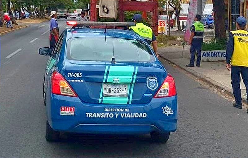 Oficiales de Tránsito Municipal de Veracruz realizaron la poda de árboles en cruceros con intenso tránsito vehicular sobre Avenida Cuauhtémoc en el puerto de Veracruz para recuperar la visibilidad de los semáforos.