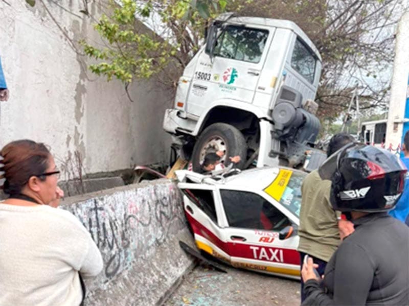 Tras el fuerte impacto, la unidad de la cervecera quedó sin control y terminó impactando a tres taxis que hacían base a orilla de carretera.