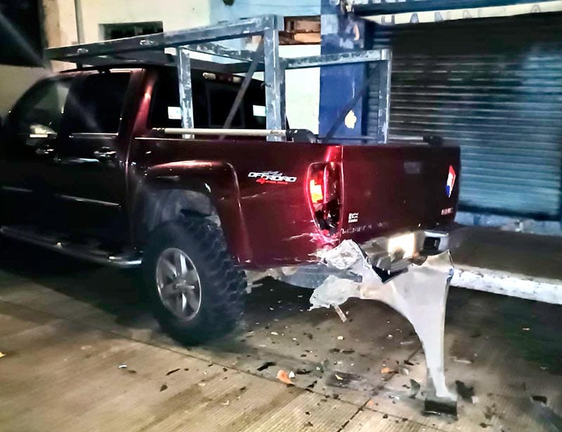 A la altura de Víctimas del 5 y 6 de Julio, y Simón Bolívar, colisionó con tres autos estacionados, dejando daños a un coche, marca Ford, tipo Focus, a una camioneta marca GMC-Canyon, dándole por alcance y un carro, marca Ford tipo Cruze, en el cual rebotó uno de los coches. Tras oír el estruendo, los dueños salieron y siguieron a Aldo R. L.