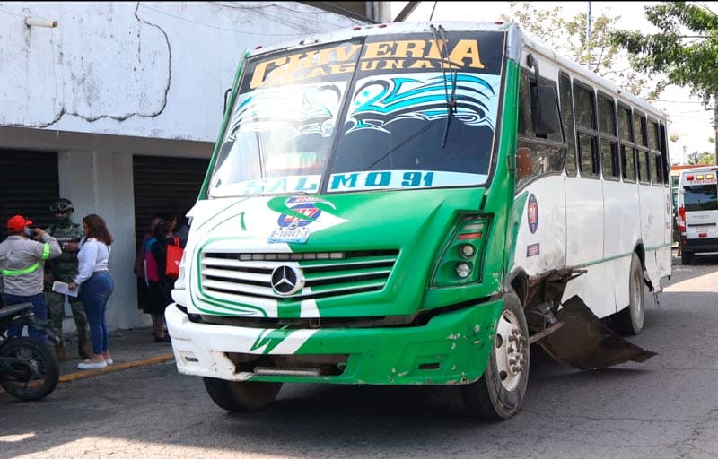 El accidente ocurrió en el cruce de las calles Juan Soto y Calle 3, donde el camión urbano, marcado con el número económico 517, fue impactado violentamente en un costado por la patrulla naval 100354, que, según testigos, circulaba a exceso de velocidad y sin usar las sirenas ni códigos luminosos.