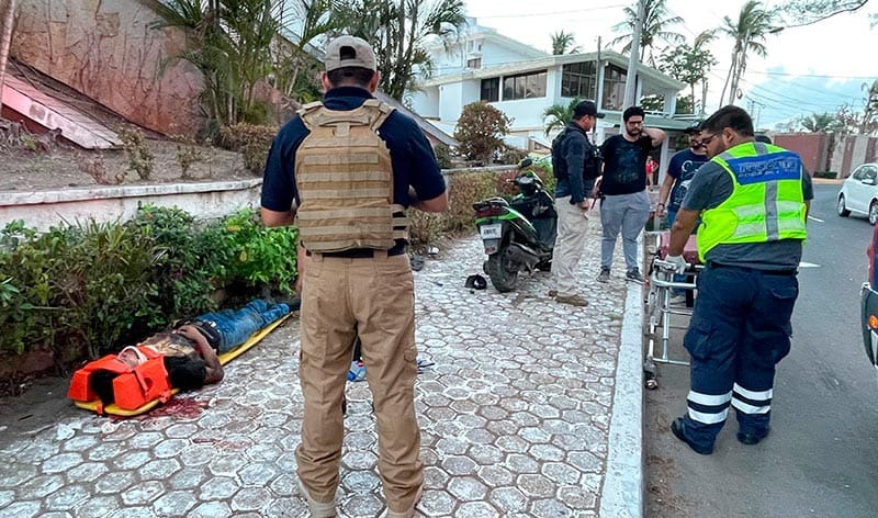 Por el golpe el motociclista también presentó lesiones y quedó tirado en la banqueta, junto al peatón.