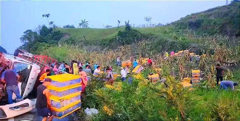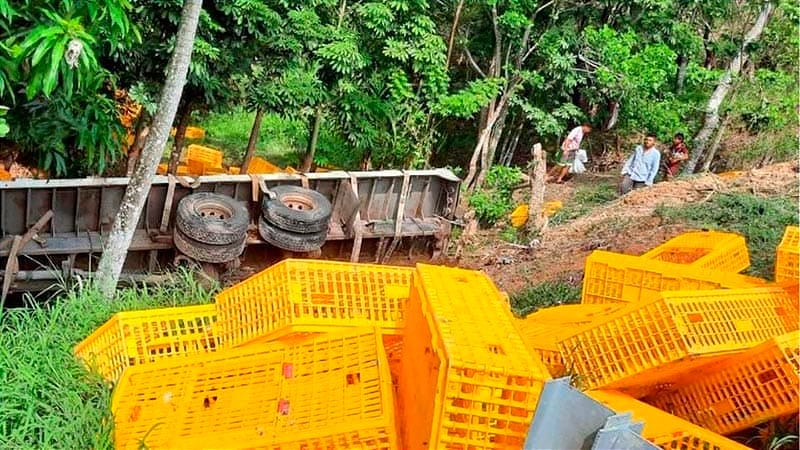 El camión siniestrado transportaba pollos vivos en rejas de plástico, aves que quedaron esparcidas en el lugar del accidente y fueron rapiñados por algunos residentes de Las Choapas y automovilistas.