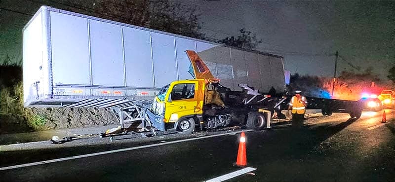 Ahí estaba un tráiler, de color amarillo, con razón social GHL, el cual jalaba un remolque tipo plana, el cual quedó incrustado contra una caja seca que estaba orillada.
