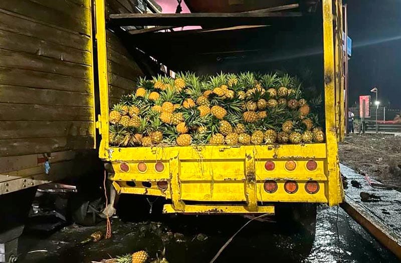 También un camión Torton que transportaba piña, el cual tenía incendiada la cabina, es más, para ese momento ya estaba reducida a chatarra, por fortuna el operador pudo ponerse a salvo.