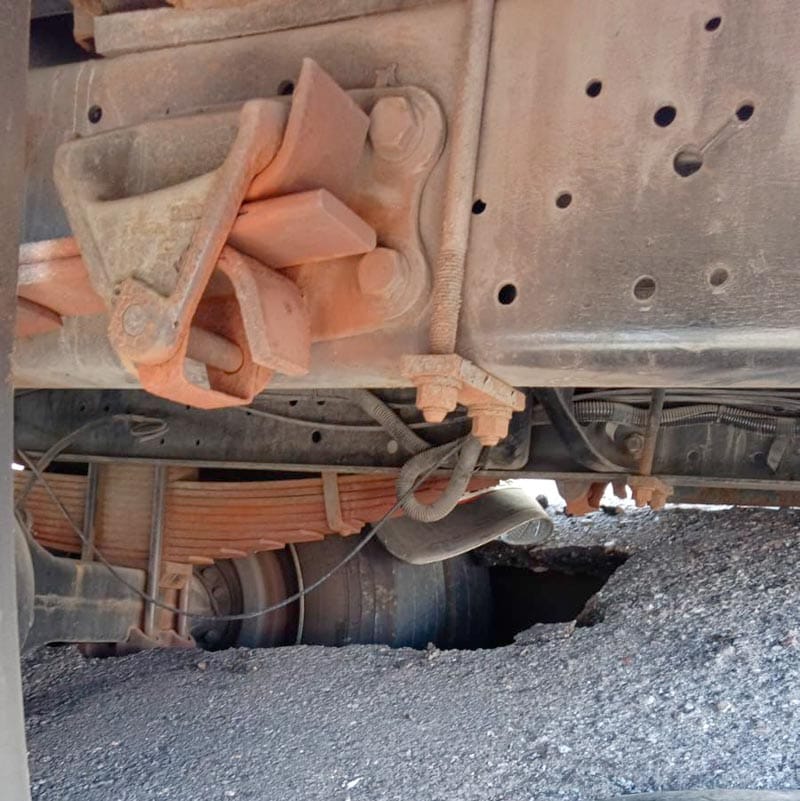 De acuerdo con los primeros informes, el hundimiento aparentemente no tenía esas dimensiones momentos antes, pero al pasar la unidad, el material cedió y una de las llantas traseras cayó en el agujero, dejando la unidad atorada.
