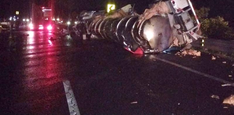 Un tractocamión acoplado a doble semirremolque cisterna chocó y volcó la madrugada del domingo sobre autopista Perote-Xalapa, a la altura del poblado El Fresno municipio de Tlacolulan, en el accidente murió prensado el chofer.