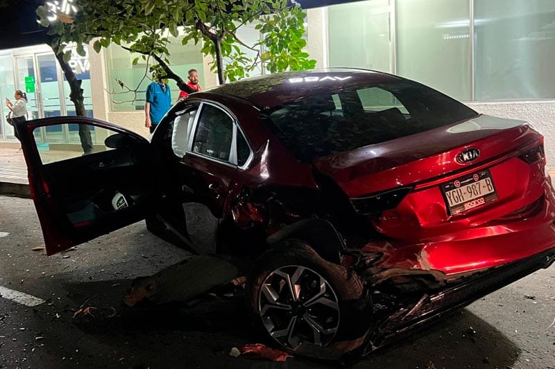 Tras el impacto, el vehículo Kia terminó proyectado contra un árbol, mientras que la carroza funeraria brincó el camellón y quedó en sentido contrario.