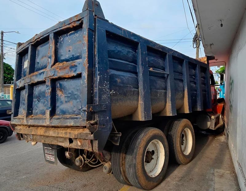 La unidad, tipo volteo quedó asegurada por elementos de Tránsito y Vialidad Municipal para deslindar responsabilidades.