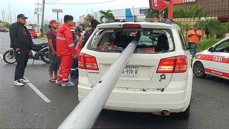 El poste, convertido en proyectil, prácticamente degolló al conductor de la camioneta Chrysler Journey, quien regresaba del súper acompañado por los integrantes de su familia, provocándole la muerte instantánea.