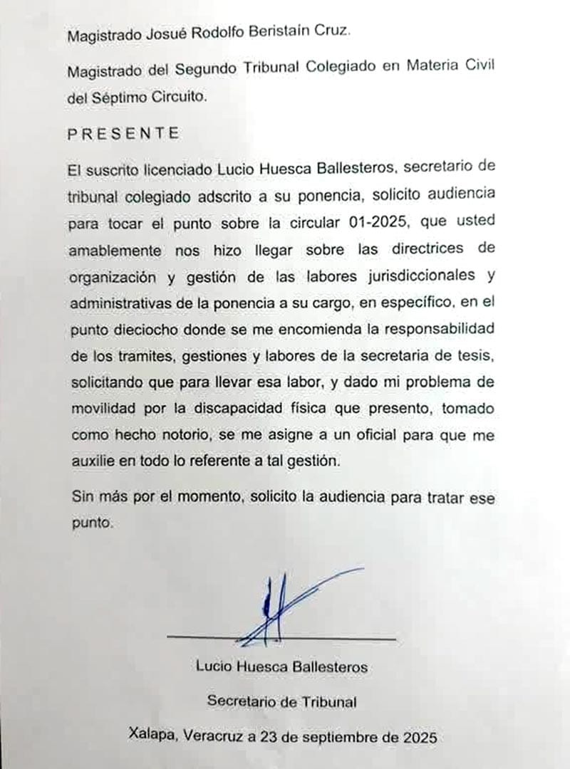 En un oficio fechado el 23 de septiembre de 2025, el propio funcionario solicitó apoyo derivado de su discapacidad motriz, petición que fue atendida por la ponencia correspondiente mediante la asignación de personal para tareas relacionadas con movilidad, como el traslado de expedientes e información.