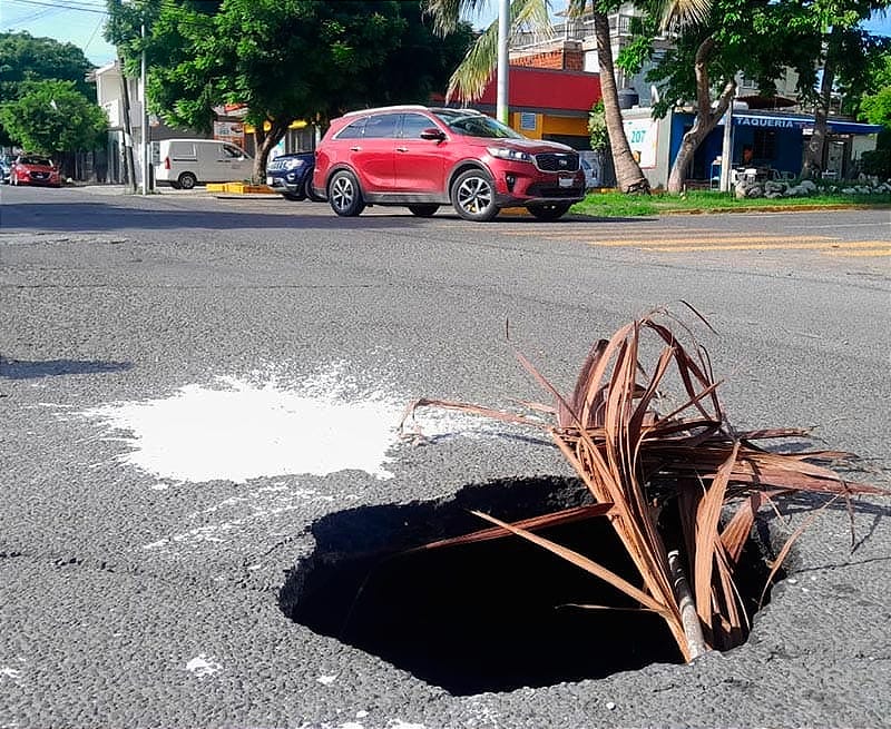 A tan sólo una cuadra del lugar, en la esquina de Colón y Dos de Abril, otro socavón, señalado precariamente con una rama de palma, evidencia la creciente frecuencia de estos fenómenos en el fraccionamiento Reforma.