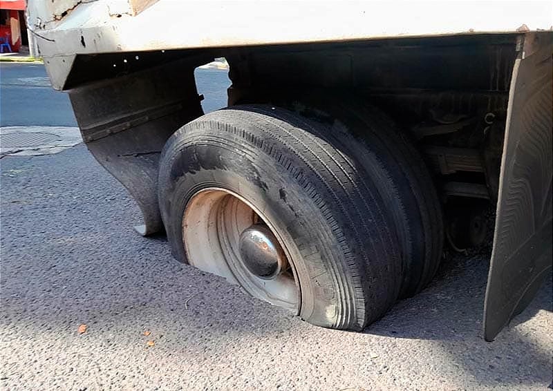 Al descender de la cabina, descubrió que las llantas traseras del costado derecho habían caído en un socavón que se formó de manera repentina, imposibilitando cualquier avance del vehículo.