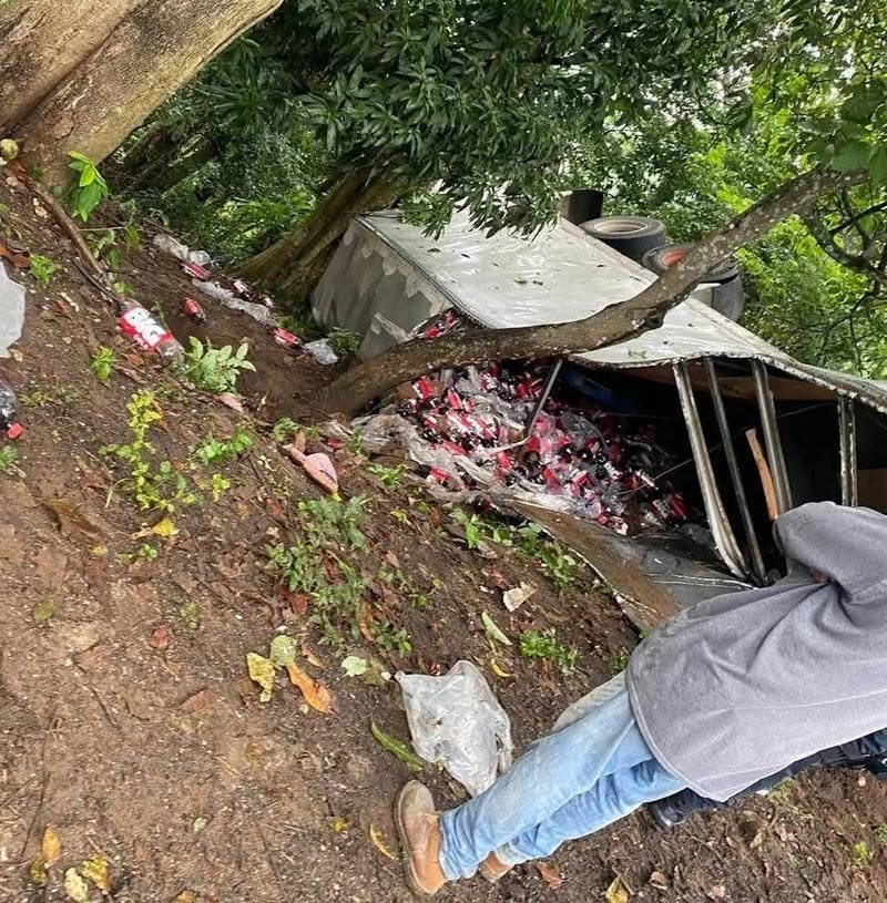 La policía constató que estaba volcado un camión torton International de color blanco, con la carga regada a un costado de la carretera, botellas de Big Cola.
