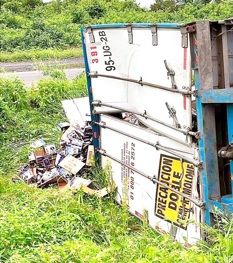Al arribar la policía de SSP estableció que sobre la cuneta del camellón que divide los carriles estaba volcado sobre el costado izquierdo un tractocamión acoplado a doble semirremolque tipo caja seca.