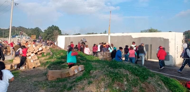 Esperanza, Puebla.(AVC).- Un tráiler que transportaba productos de abarrotes volcó este miércoles poco antes de llegar a la caseta de peaje 027 de la Autopista 150D Orizaba-Puebla, en el municipio de Esperanza, lo que provocó un saqueo masivo por parte de decenas de vecinos que llegaron al lugar para llevarse la mercancía.