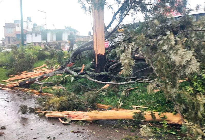 Una dama que viajaba como pasajera en el taxi XL-4220 sufrió amputación de una mano cuando un árbol cayó sobre el auto al partirse tras la caída de un rayo sobre Avenida Lázaro Cárdenas, en Xalapa.