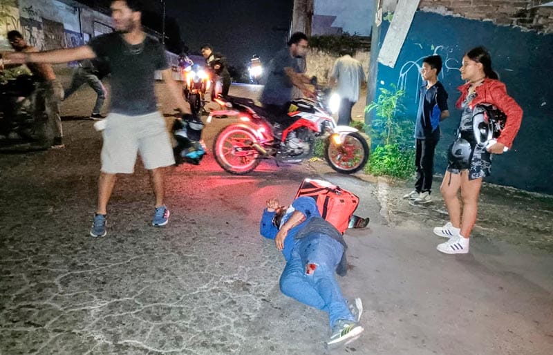 En calles de la colonia Pocitos y Rivera, en la ciudad de Veracruz, un motociclista repartidor se accidentó presuntamente iba a exceso de velocidad y al llegar a unos topes, perdió el control y derrapó varios metros sobre el pavimento.