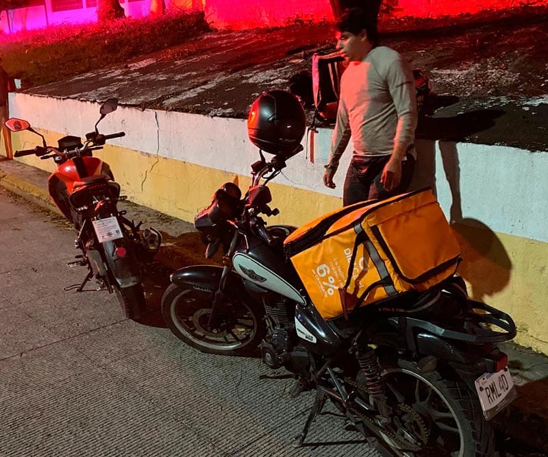 En la bajada del bulevar Miguel Alemán, a la altura de la zona de Mocambo, en Boca del Rio, dos jóvenes motociclistas, quienes laboran como repartidores de DiDi, derraparon luego de resbalarse con una mancha de aceite.