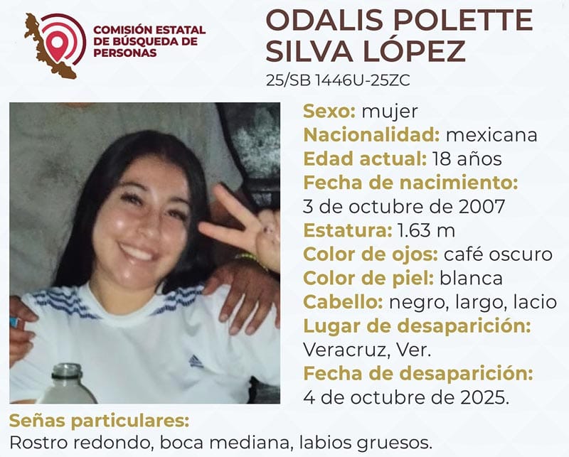 En tanto que la joven reportada como desaparecida es Odalis Polette Silva López, de 18 años de edad, con quien se perdió contacto el sábado 4 de octubre.